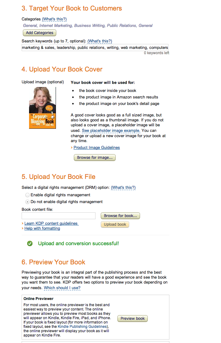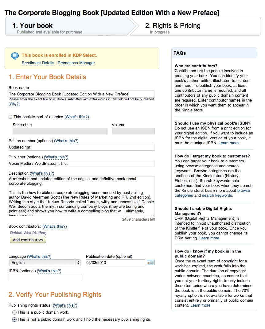 If you’re wondering what Amazon’s KDP (Kindle Direct Publishing) interface looks like, below are two screenshots of my Amazon KDP account showing the information entered for The Corporate Blogging Book (Updated Edition).